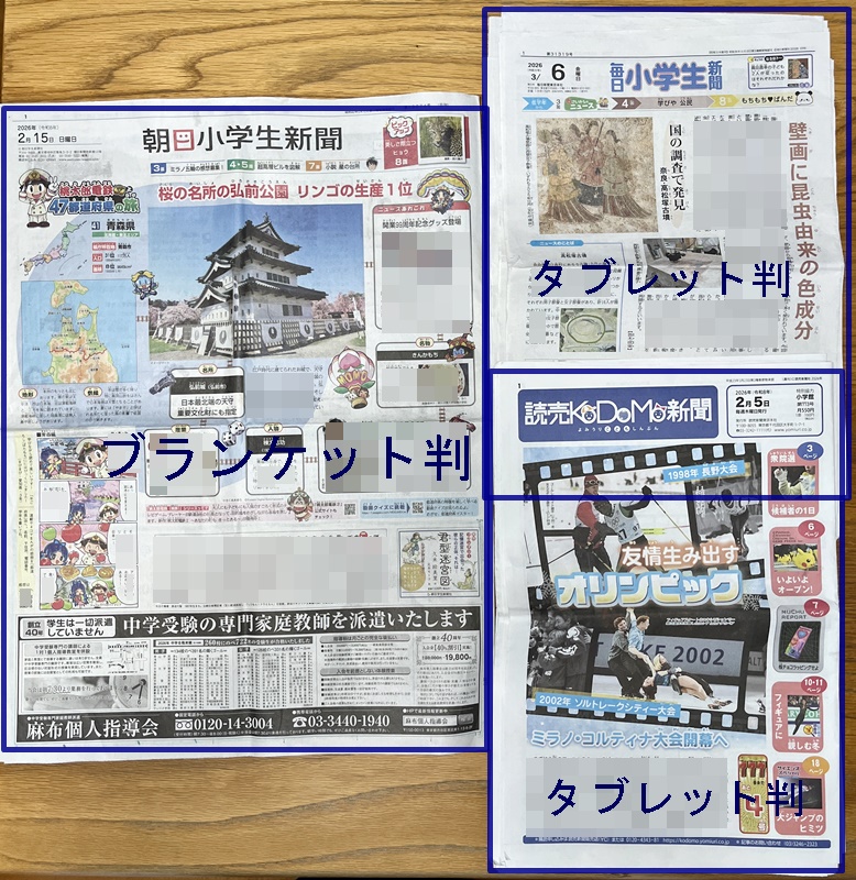 朝日小学生新聞の「ブランケット判」は、読売・毎日の「タブレット判」の2倍の大きさです。