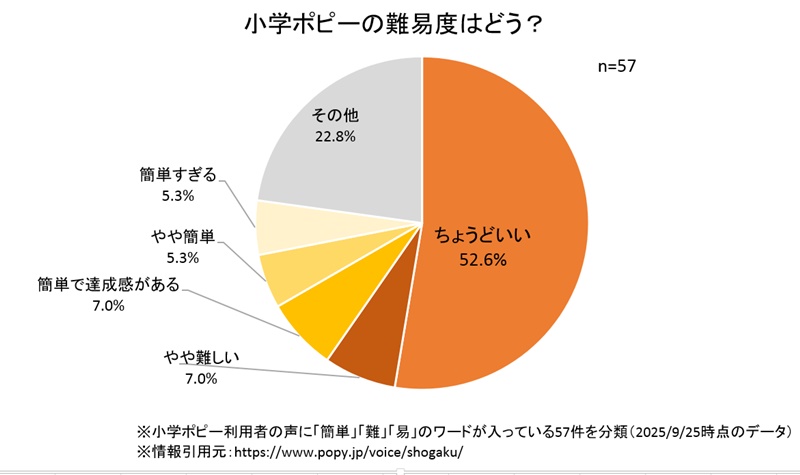 難易度に関してコメントしている声57件の内容を確認すると、「ちょうどいい」が52.6%、「簡単すぎる」は5.3%でした。