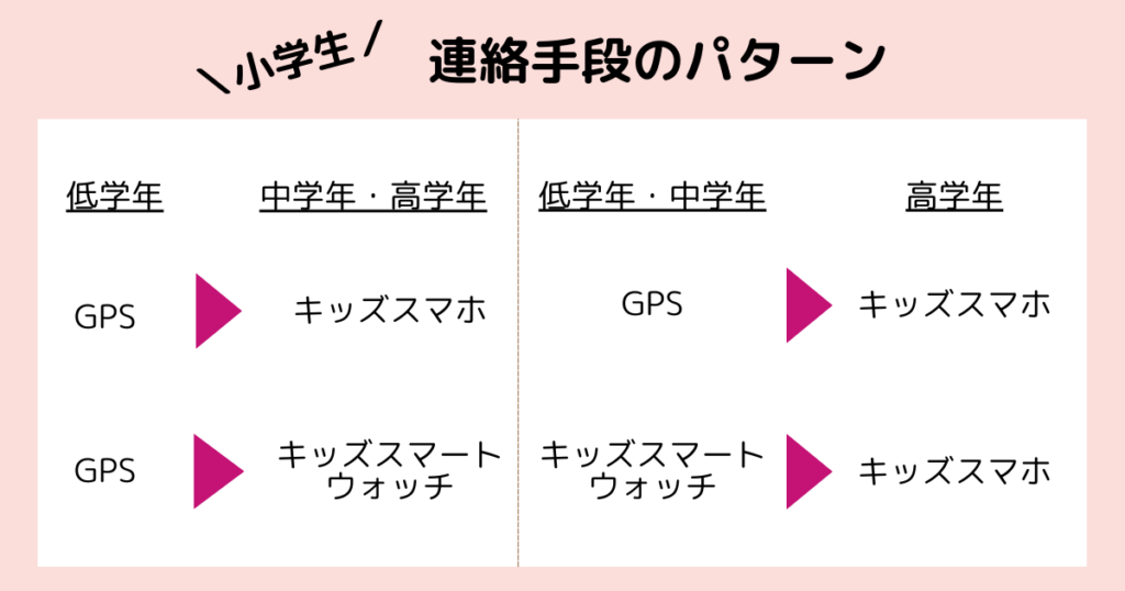 基本的に小学校低学年ではGPSが、中学年・高学年にはキッズスマホかキッズスマートウォッチがおすすめです。