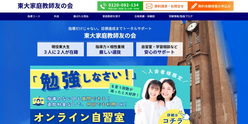 その他にも、難関校を目指しているお子さんには「東大家庭教師友の会」、自習の習慣を身につけて勉強時間を増やしたいお子さんには「勉トレ」がおすすめです。