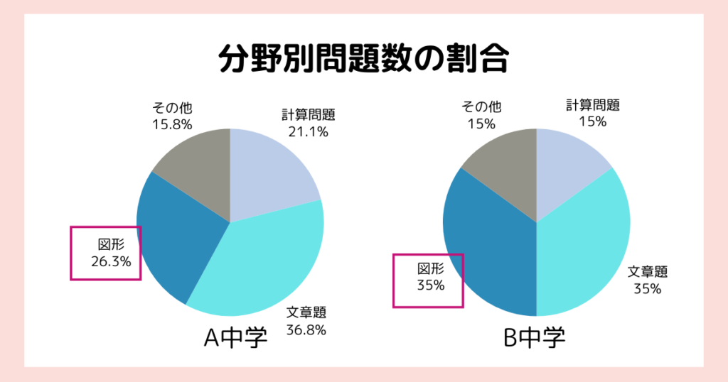 過去問で確認してみると、A中学は26.3%、B中学は35%を図形問題が占めていました。